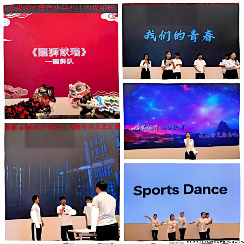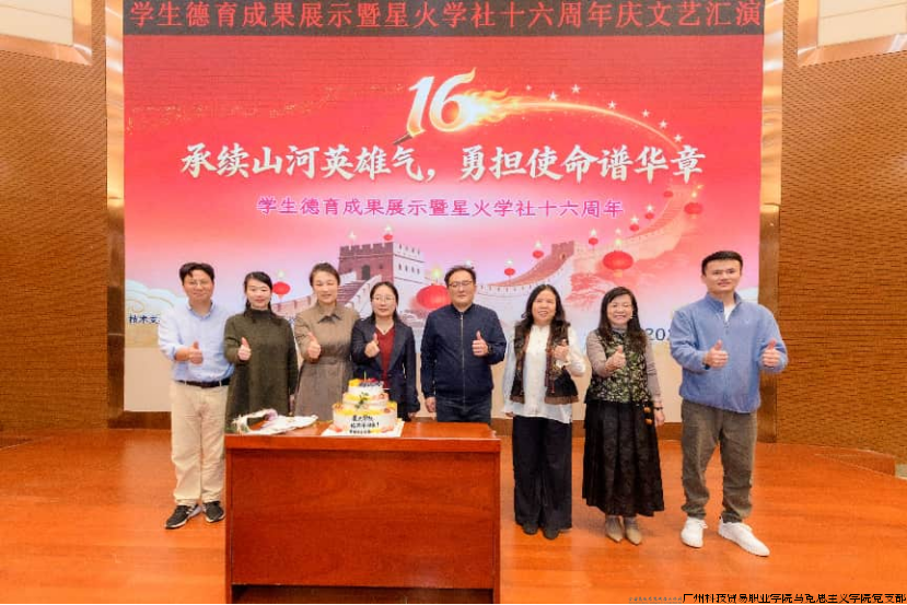 12月22日晚,马克思主义学院主办、星火学社承办的“承续山河英雄气 勇担使命谱华章”——星火学社十六周年庆典暨学生德育成果展示文艺汇演在广州科技贸易职业学院行政楼学术报告厅隆重举行,本次活动旨在展示学校德育教育成果,彰显星火学社十六载育人风采。校团委书记何雪莉、图书馆馆长李小孟、现代教育技术中心(实训实验室)副主任方楚鑫,马克思主义学院书记、院长丁西泠,副院长陈琴和思政课教师出席了活动。