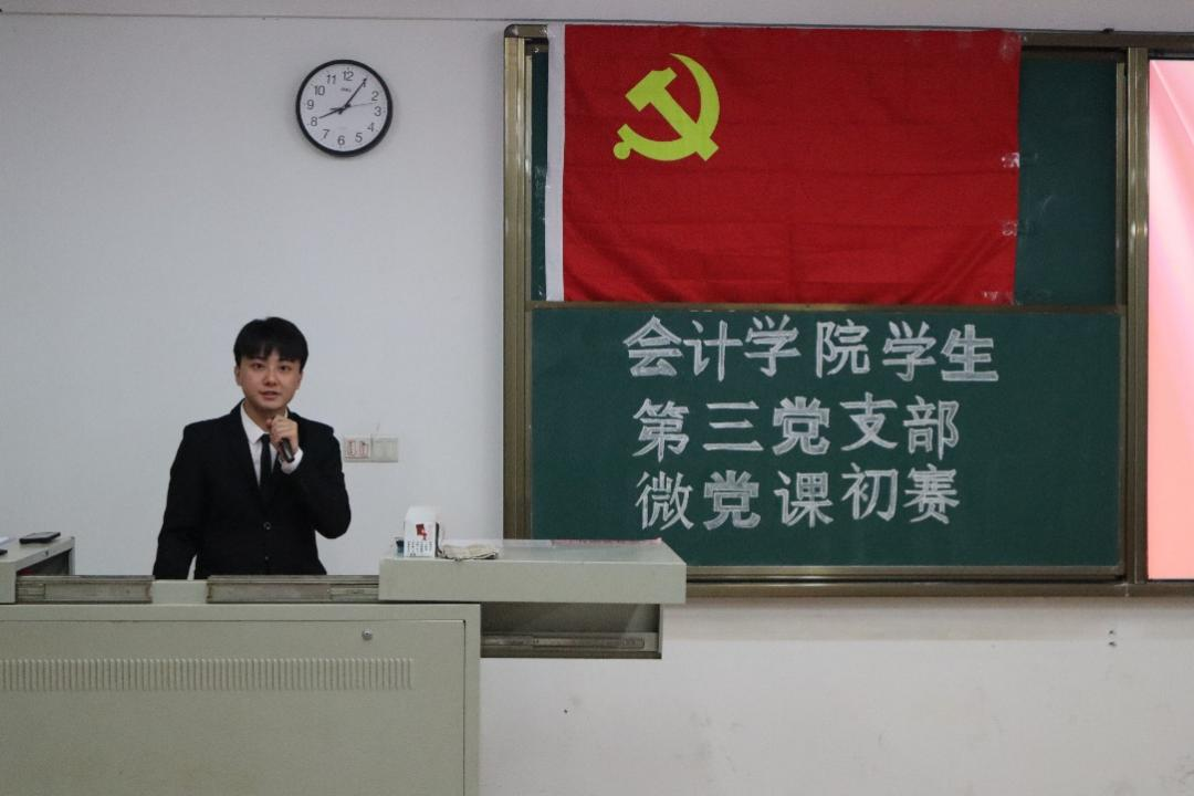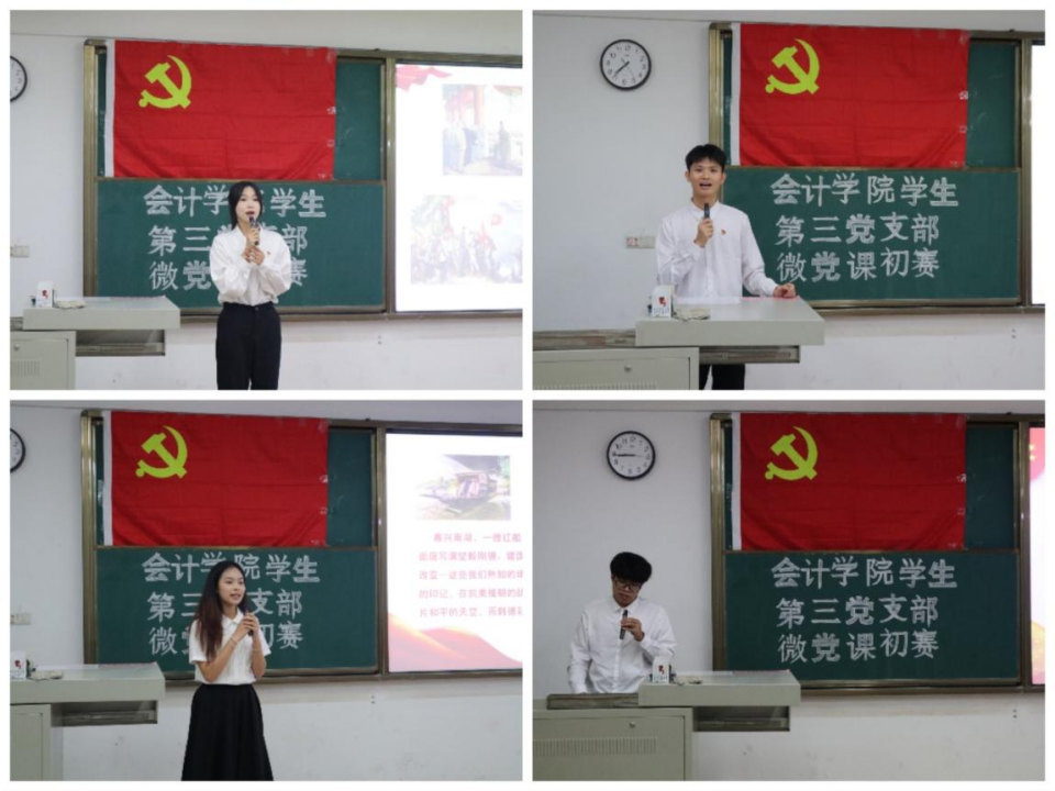 本次初赛共有十六名党员同志报名参加。十六名党员同志以“深入学习贯彻习近平新时代中国特色社会主义思想”作为首要内容,围绕“学党纪 明规矩 强党性”、“庆祝新中国成立 75周年”等主题,依次开展“微党课”授课演讲。党员同志结合自身学习感悟及身边故事,以“小故事”讲述“大道理”,“小切口”体现“大主题”的形式,以案促学、以案为鉴,从身边事、身边人中吸取经验教训,真正受警醒、明底线、知敬畏。党员同志以身作则、率先垂范,发挥党员的先锋模范作用,做到先学先知、先悟先行,影响并监督会计学院学生第三党支部的全体党员同志加强党性锻炼,认真践行社会主义核心价值观,练就过硬本领,勇于创新创造,矢志艰苦奋斗。