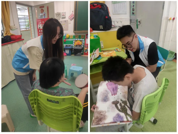 在开展志愿服务之前,社工和志愿者们对会计学院学生第三党支部的党员同志们进行简单的培训和注意事项的讲解,并明确了各自在本次志愿服务的职责。随后,党员同志们走进启智学校的课室,与孩子们进行“一对一”的深入交流和个性化辅导。在“一对一”授课过程中,支部同志们积极结合自身专业特点,为启智学校的孩子们奉献爱心,提供帮助,传递温暖。同时,党员同志们还为启智学校的孩子们专门安排了特色手工课程。党员同志们围绕习近平新时代中国特色社会主义思想主题、党的二十大精神、井冈山精神等主题,以趣味手工、故事宣讲、红歌联唱、互动问答等多种形式,引导孩子们深刻理解红色文化的精神内涵,激发他们的爱国情怀和民族自豪感。