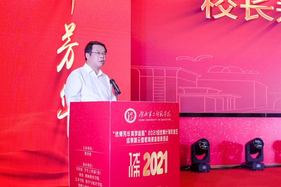 2021年以优秀乡村教师代表身份,参加学校“优师计划”开班仪式的丹江口市三官殿中心小学副校长蔡明镜,再次受邀来校,讲述了自己向下扎根的教学成长经历。教育科学学院班主任刘晶晶作为教师代表,分享了学院“思想铸魂、专业储能、实践赋能”的教培理念。即将赴长阳县一中任教的数学与统计学院毕业生陈树芳作为优师毕业生代表发言。