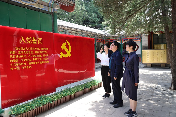 首先,老师们来到益寿堂参观了“古都春晓——寻访中国共产党‘进京赶考’之路”主题展览。益寿堂是毛泽东等中国共产党领导人“进京赶考”到北平后的首个落脚点,它见证了北平和平解放的曲折历史,也见证了毛主席与民主人士真挚交流的轶事佳话。展览分为“春晖沐浴古曦园”、“进京赶考第一天”和“诗词唱和照肝胆”三部分内容,通过珍贵档案、园藏文物、百余幅珍贵历史照片等资料,老师们重温红色记忆,对革命前辈坚守理想信仰的崇高革命精神和统一战线的法宝作用有了更深刻的感受。参观结束后,党委统战部党支部书记陈志带领支部全体中共党员重温入党誓词,不忘来时初心,牢记政治使命。