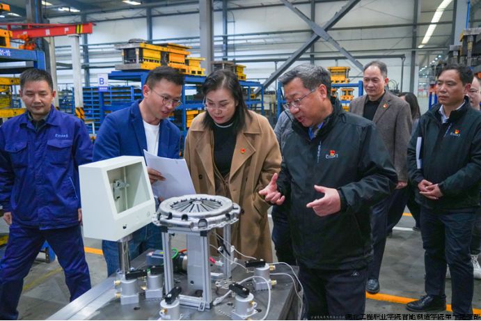 刘红霞一行参观了湖北三环离合器有限公司企业展厅、党建文化长廊及生产现场,详细了解企业发展历程、党建工作情况、技术创新成果及生产经营现状,对该企业近年来取得的丰硕成果给予高度肯定。在生产一线,刘红霞亲切慰问了我校在三环离合器有限公司工作的毕业生代表雷永顺、王维、陶笙。得知他们已逐步成长为企业技术骨干,校领导与随行教师倍感欣慰,勉励他们立足岗位持续精进技术能力,为企业高质量发展贡献更大力量。