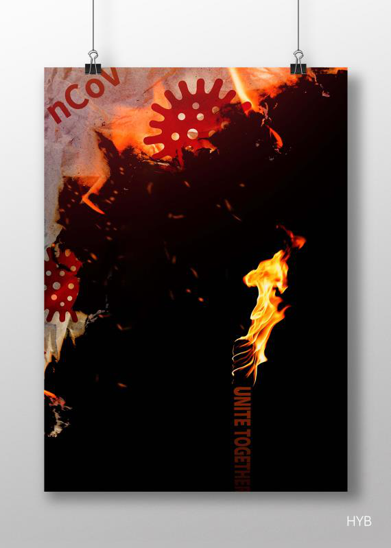 这幅题为《殆尽》的海报是胡易冰老师为抗击疫情精心设计的作品。病毒害怕高温,该设计以一根燃烧的火把为主体,火把将病毒燃烧殆尽,而火把柄“Unite together”则意为“团结在一起”,志如炬火、势如烈焰,表现了全国人民团结一致就一定能够战胜疫情的必胜信心。