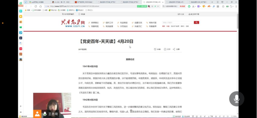 本次“党员教师党史天天讲”活动由学生支部党员教师王思琦同志讲述4月20日重要论述。1941年4月20日关于英美及中国各派政治力量的态度及我们的方针,毛泽东复电周恩来。电报指出:在德国打击下,英国对苏邦交即将好转,美国亦将大体上取英国的步骤,决不能得罪苏联。中国英美派,顽固派,中间派及进步派中之动摇分子,均将在英、美影响下对苏献媚。英、美总方针是先对德后对日,决不敢对日本取强硬态度。我们方针是要争得蒋及国民党主体转变到亲苏、和共、改良的方向,而以维持他们的政权、承认我们的地位为条件。这封电报收入《毛泽东文集》第二卷。