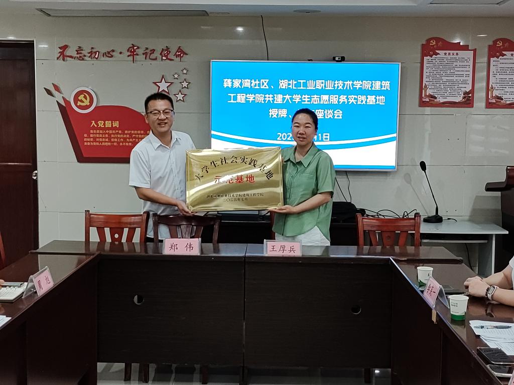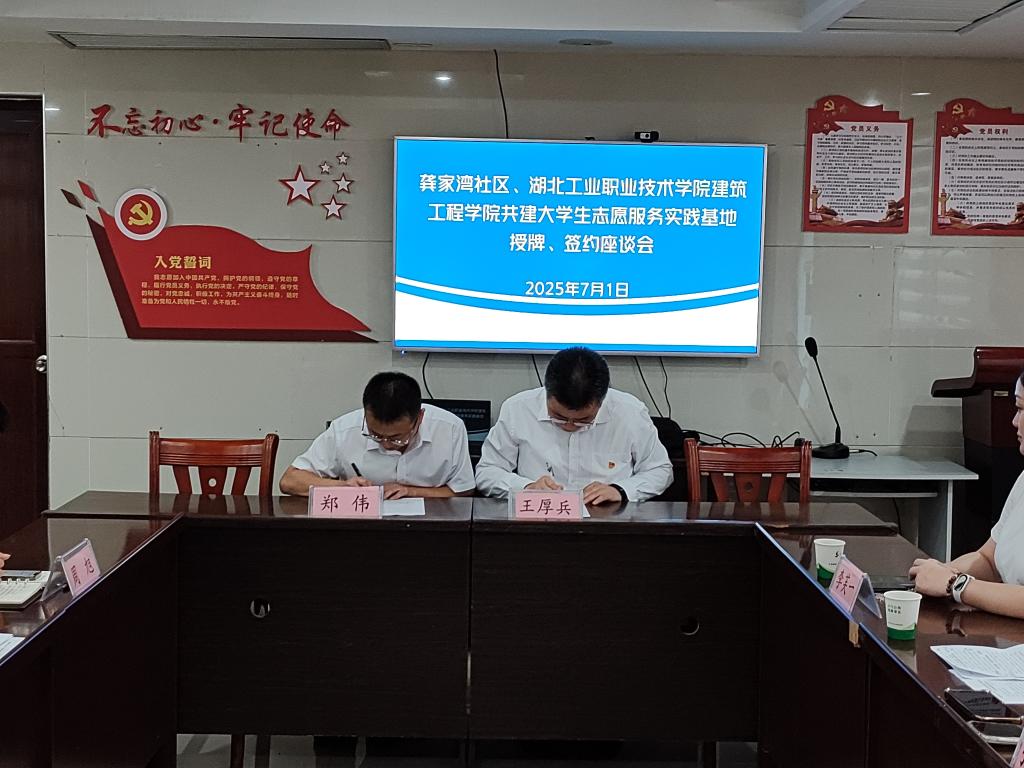 7月1日下午,湖北工业职业技术学院建筑工程学院与龚家湾社区在社区会议室举行大学生志愿服务实践基地共建签约授牌仪式,2025年湖北省“爱心托管班”七彩假期志愿服务同步启动。双方签署志愿服务合作协议并为基地揭牌,标志着校地协同推进实践育人与儿童关爱服务正式落地。