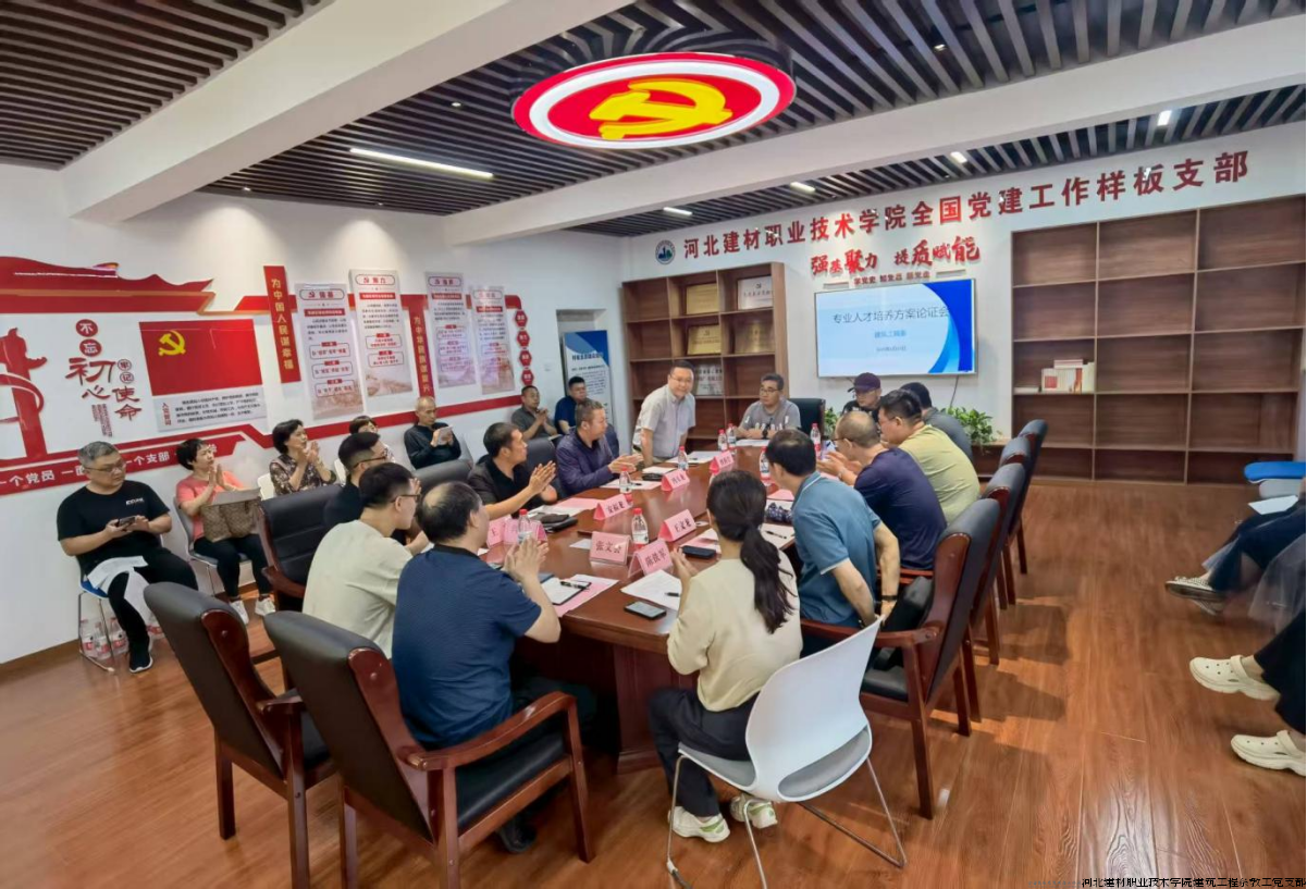 2025 年 6 月 27 日,一场聚焦建筑工程技术专业人才培养方案的论证会在全国党建样板支部顺利召开,河北建材职业技术学院建筑工程系党总支书记张文会,副主任杨福云,教工党支部书记王岩,专业群带头人杜秉旋、专业群带头人陈铁军等教师参与其中,为专业人才培养方案的优化贡献力量。