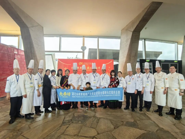 活动以春节庙会形式呈现,由中国常驻联合国教科文组织代表团与中国烹饪协会联合主办。来自北京、辽宁、浙江、湖北、广东、四川、山西等7个省(直辖市)10个地市的非遗美食与中华老字号集中亮相。经湖北楚菜研究院推荐,仙桃市烹饪酒店行业协会会长、湖北楚菜研究院特聘研究员伍峰与湖北允泰坊食品有限公司董事长杨克勤,作为湖北代表受邀参加。楚菜大师伍峰精心呈现“九味桌盒”“沔阳两道茶”等楚菜经典,重点推介仙桃黄鳝、沙湖红心咸蛋、沔城莲藕等地标产品,向世界展示江汉平原非遗美食独特的舌尖味道和文化魅力。联合国教科文组织工作人员在品尝后称赞:“楚菜美食不仅是一种味觉享受,更是连接不同文化的一座桥梁。”