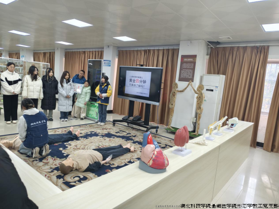 标本馆工作人员现场演示了心肺复苏(CPR)操作,动作规范、神情专注,展示了在黄金四分钟内进行有效急救的步骤,同学们全神贯注地学习记录。这一场景不仅体现了同学们对急救知识的重视,更彰显了他们对生命的敬畏与尊重。