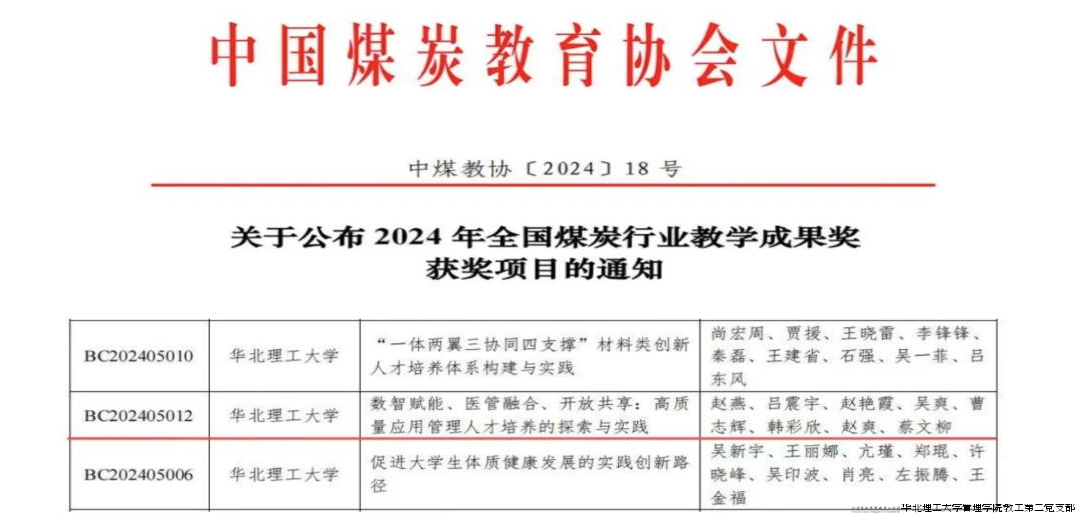《全国煤炭行业教学成果奖》是煤炭行业广大教育工作者在教学岗位上,经过多年努力,潜心研究取得的创造性成果,体现了近年来煤炭行业广大教育工作者在立德树人、严谨笃学、教学改革、人才培养等方面所取得的重要成绩反映了煤炭行业教育教学研究水平,具有创新性、先进性、代表性和较高的推广价值。在2024年全国煤炭行业教学成果奖评选中,《数智赋能、医管融合、开放共享:高质量应用管理人才培养的探索与实践》荣获二等奖。该项目紧密结合行业发展需求,通过数智化技术的运用,医管深度融合的人才培养模式创新,搭建开放共享的虚拟实验平台,培养高质量应用管理人才提供了新的路径。这一成果的取得,不仅体现了学院在教育教学方面的创新实践,也彰显了教师党员凝聚师生服务行业发展的责任与担当。