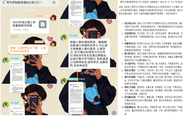 7月上旬,全院教职工自主学习习近平关于教育的重要论述及师德师风相关规章制度,通过深度自学与反思,深刻领会“为党育人、为国育才”的核心使命,为后续开展系列师德建设活动奠定了坚实的理论基础与思想准备。
