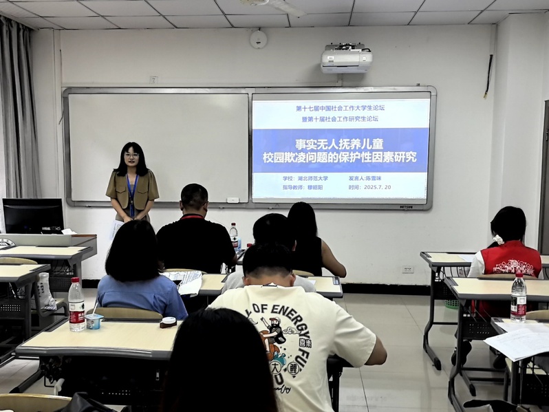 2025年7月18日至20日,由中国社会工作教育协会主办、四川外国语大学承办、美亚联创(北京)科技有限公司提供技术支持的“第十七届中国社会工作大学生论坛暨第十届社会工作研究生论坛”在重庆成功举办。本次论坛以“中国式现代化与社会工作创新发展”为主题,吸引了全国189所高校的50余名教师与450余名学生齐聚一堂,围绕社会工作前沿理论与实践展开深入交流。湖北师范大学历史文化学院社会工作专业研究生陈雪咪、蔡菲菲凭借论文《事实无人抚养儿童校园欺凌问题的保护性因素研究》成功入选,并在分论坛中分享研究成果。