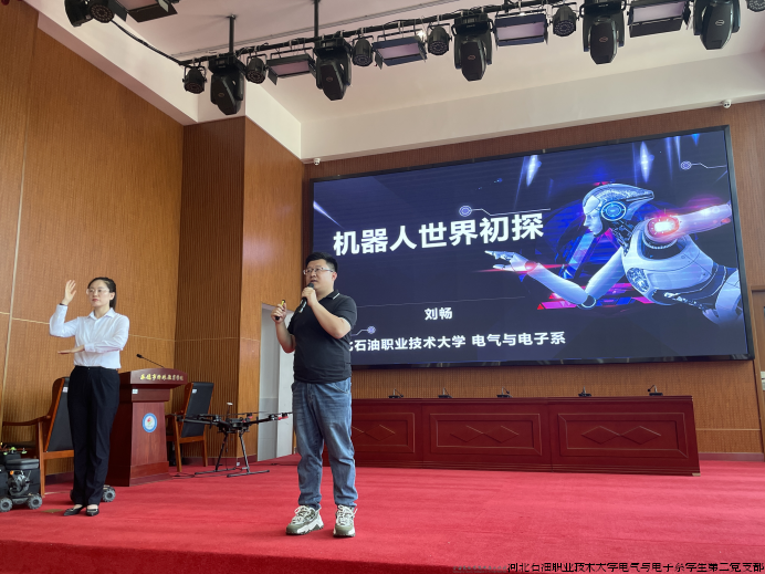 活动伊始,由电气与电子系团总支书记、电子教研室主任刘畅采用多样化且极具趣味性的教学方式,为学生们开展了机器人科普讲座,通过生动形象的图片、视频以及通俗易懂的语言,深入浅出地讲解了人工智能的基本概念、应用领域以及发展历程,让学生们更直观地理解这项技术与生活的紧密联系。