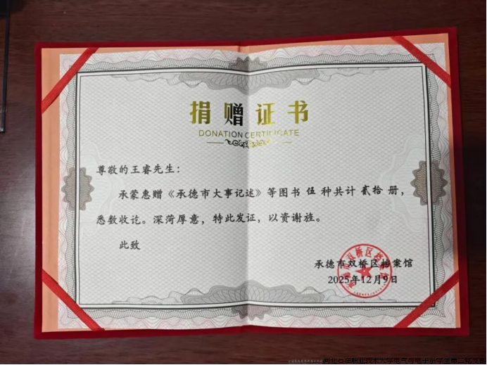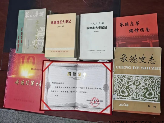 近日,河北石油职业技术大学电气与电子系学生第二党支部教师党员王睿,将其个人收藏的一批珍贵承德地方史志资料无偿捐赠给双桥区档案馆,充分展现了一名教师党员的责任担当与文化情怀。双桥区档案馆特向我校致信感谢,并对学校在立德树人、服务地方、推动区域文化建设方面取得的成效给予高度认可。