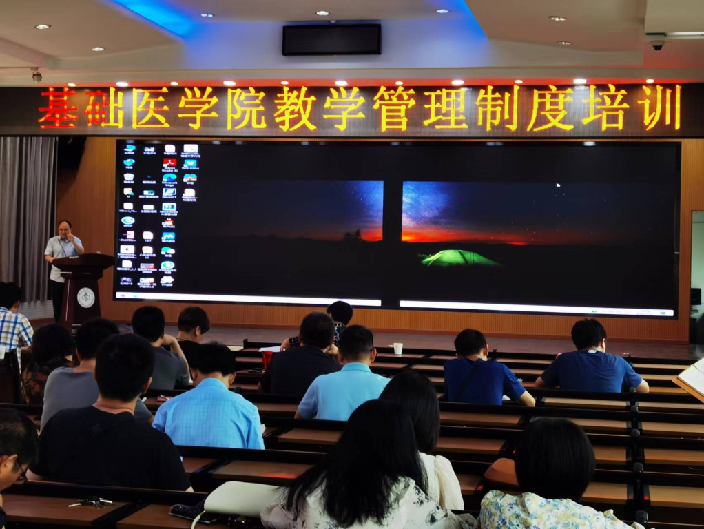 为规范教师从教行为,维护正常教学秩序,保障学生合法权益,培养全面发展医学生,7月2日上午,基础医学院在六楼会议室对全院教职工开展了教学管理制度培训。院领导、分党委委员、管理人员、各科室主任、副主任及教学秘书参加会议,其他教职工通过腾讯会议同步参加线上会议,会议由院长唐俊明主持。