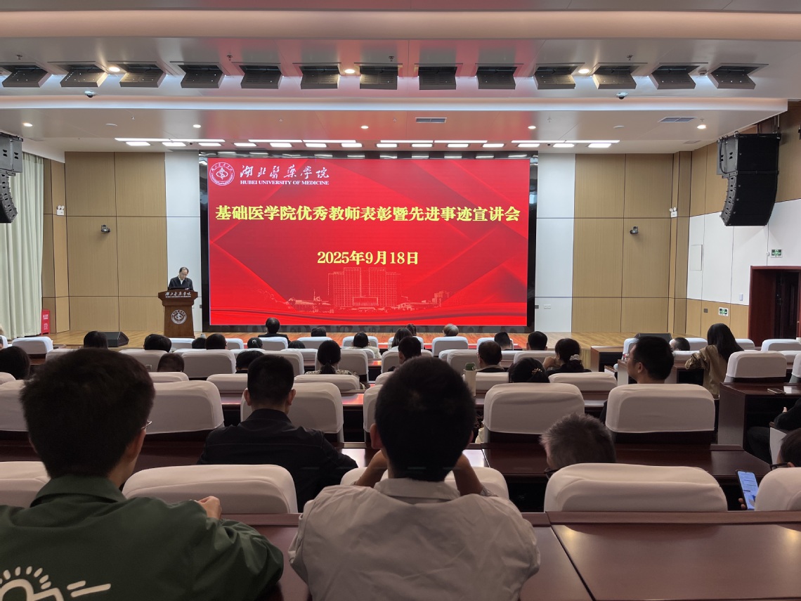 为大力弘扬教育家精神,宣传优秀教师先进事迹,营造尊师重教良好氛围,9月18日下午,基础医学院在公卫大楼二楼学术报告厅召开优秀教师表彰暨先进事迹宣讲会。校党委常委、副校长严世荣出席会议,基础医学院全体无课教职工参会。学院党委书记赵万红主持会议。基础医学院第一党支部书记汪静杰同志参加学院优秀教师表彰大会并受邀作先进事迹宣讲。