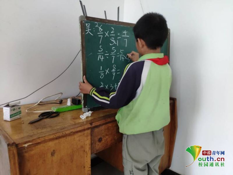 为期22天的线上支教服务结束后,部分志愿者根据当地现有条件,在甘肃省定西市渭源县莲峰镇开展线下入户支教服务。烈烈骄阳阻挡不了志愿者的脚步,即便没有专门的教学器材,但只要师生同心,一块小黑板,一盒粉笔,一张桌子足以撑起这个温馨小课堂,志愿者在小黑板前滔滔不绝,兴致勃勃地讲解各个知识点,学生则端正的坐在小桌旁,时而喜笑颜开,时而若有所思,挠挠头,抓抓手,蚊子不停地和学生嬉戏,他们一遍驱蚊,一边认真思考,细心的志愿者注意到后给他们喷了一点花露水,整个教室都香香的,炎炎夏日,与这群小朋友在一起,好像回到了小时候,一起玩游戏,猜谜语,讲习题……充满童真的他们没有那么多的拘谨,不需要那么的秩序,他们有的是天真无邪,是自由的表达自己的想法,生气了就撅起小嘴,高兴了就开怀大笑,在一起的时光会让人忘记烦恼,徜徉快乐大海。图为线下辅导时学生写习题 中国青年网通讯员 李娜 摄