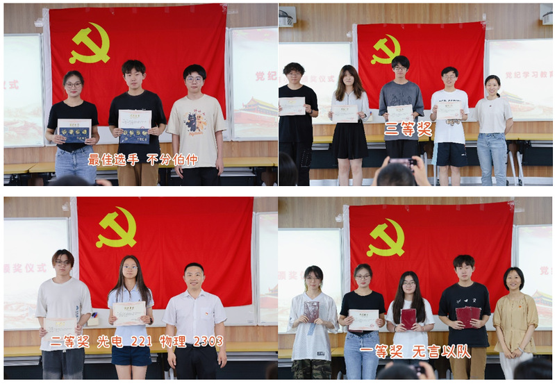 为深入学习贯彻习近平新时代中国特色社会主义思想和党的二十大精神,推进落实党中央《关于加强新时代廉洁文化建设的意见》,推动党纪学习教育走深走实,引导师生学纪、知纪、明纪、守纪,6月21日下午,物理学院奉贤辅导员-学生党支部举办了生动有趣的“学纪知纪增强党性,明纪守纪青春建功”党纪学习教育小组答题比赛活动。物理学院党委副书记冉博、团委书记杨少明、辅导员何宇瑶以及物理学院奉贤辅导员-学生党支部全体成员、各参赛小组成员、本科生代表等参加本次活动。