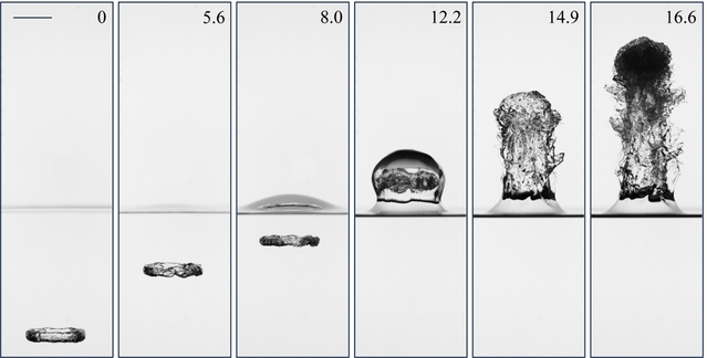 团队基于傅汝德数Fr和韦伯数We建立了理论模型,确定了此种高速射流现象产生的临界条件,并验证了该理论在不同空间尺度下的普适性,揭示了惯性力、重力、表面张力在自由液面射流形成过程中的相互竞争机制,全面探讨了空化涡环与自由液面的相互作用,拓展了涡环气泡与多相界面相互作用的新模式。