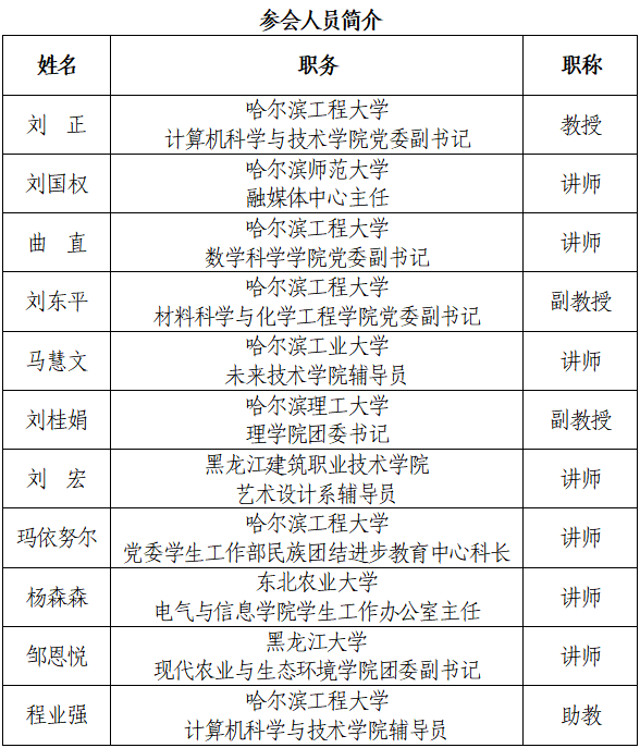 本次活动在哈尔滨工程大学举办,由国家级辅导员名师工作室主持人、哈尔滨工程大学计算机科学与技术学院党委副书记刘正教授主持,参加本次研讨的嘉宾均为在哈院校一线岗位工作辅导员