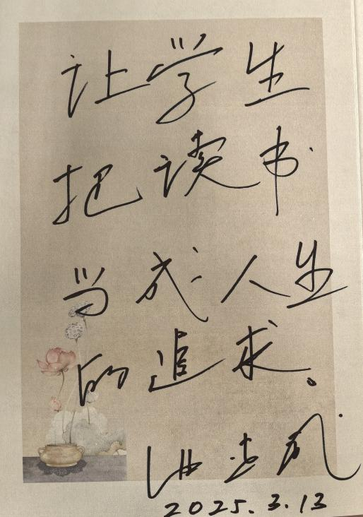 活动结束后,各位教师移步图书馆参观了我校科技成果展厅,图书馆党委书记赵镇、馆长申楠陪同参观。曲建武教授在参观后提笔写下“让学生把读书当成人生的追求”,并与大家合影留念。