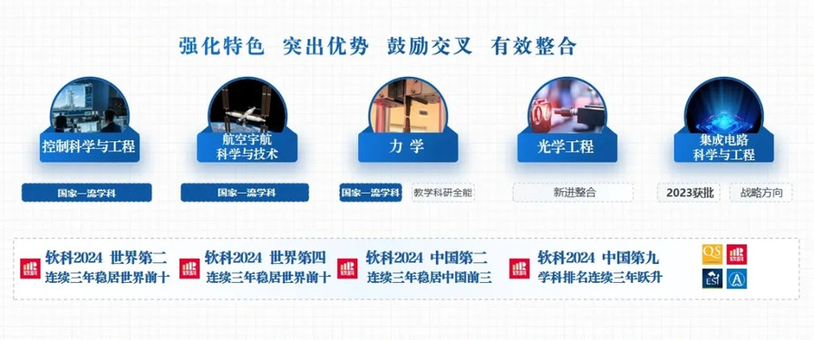 学院秉持“强化特色、突出优势、鼓励交叉、有效整合”的学科建设理念,大力推动学科交叉创新融合,学科整体布局进一步优化,形成一流学科牵引、优势学科和特色学科助推,传统学科、新兴学科、交叉学科并进的强劲态势。获批新建集成电路科学与工程交叉学科,重组光学工程学科。在2024 ARWU(软科)世界一流学科排名中,控制科学与工程学科世界排名第二,五年内上升6位;软科中国最好学科排名中,力学升至第二、宇航升至第三、控制升至第四、光学升至第十、集成电路学科从第二十攀升至第十。