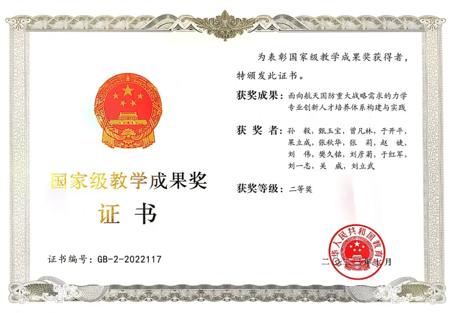 教育教学成果丰硕,《理论力学》第八版教材获首届全国教材建设奖一等奖,《新编材料力学》等6本教材荣获首届黑龙江省优秀教材奖,10本教材入选工信部“十四五”规划教材,4本入选教育部战略新兴领域教材。获国家级教学成果奖一等奖1项、二等奖2项,省级教学成果奖特等奖1项、一等奖6项、二等奖2项,获批国家级教改立项7项、省级教学改革项目60项。甄玉宝、金晶、于开平3位教授获评黑龙江省教学名师,李传江教授被科技部、中央宣传部、中国科协评选为“全国科普工作先进工作者”。学院生源质量持续提升,负责省份本科招生排名进入全国前列,研究生生源质量显著提高,4人获博士生国家自然科学基金,5人入选首届中国科协青年人才托举工程博士生专项计划,毕业生航天国防就业率连续五年稳居全校第一,实现人才培养质量的全面提升。