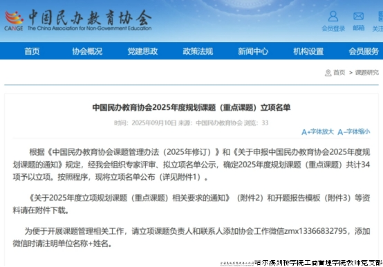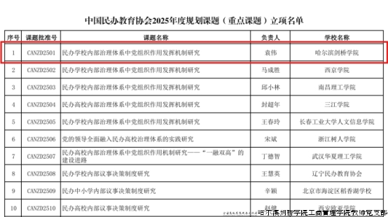 近日,中国民办教育协会发布2025年度规划课题立项公示,由我校申报的课题《民办学校内部治理体系中党组织作用发挥机制研究》,成功获批重点课题立项。