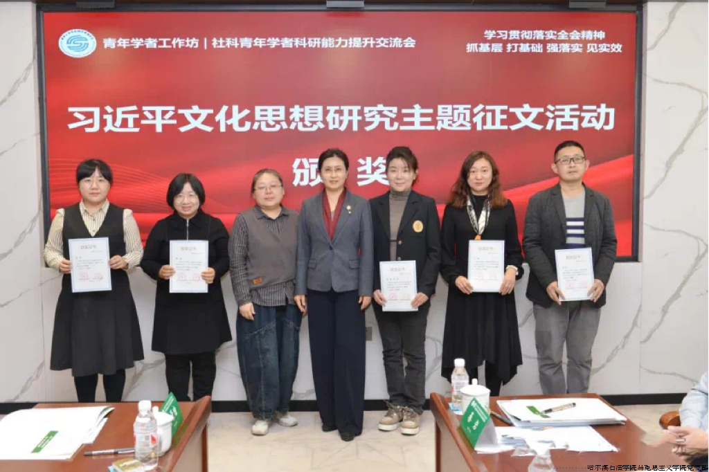 与会嘉宾为习近平文化思想研究主题征文青年获奖者、省社会科学学科优秀科研成果获奖代表及基地结项课题组颁发获奖证书。哈尔滨石油学院马克思主义学院教师王瑞作为习近平文化思想研究主题征文青年获奖者代表上台领奖。