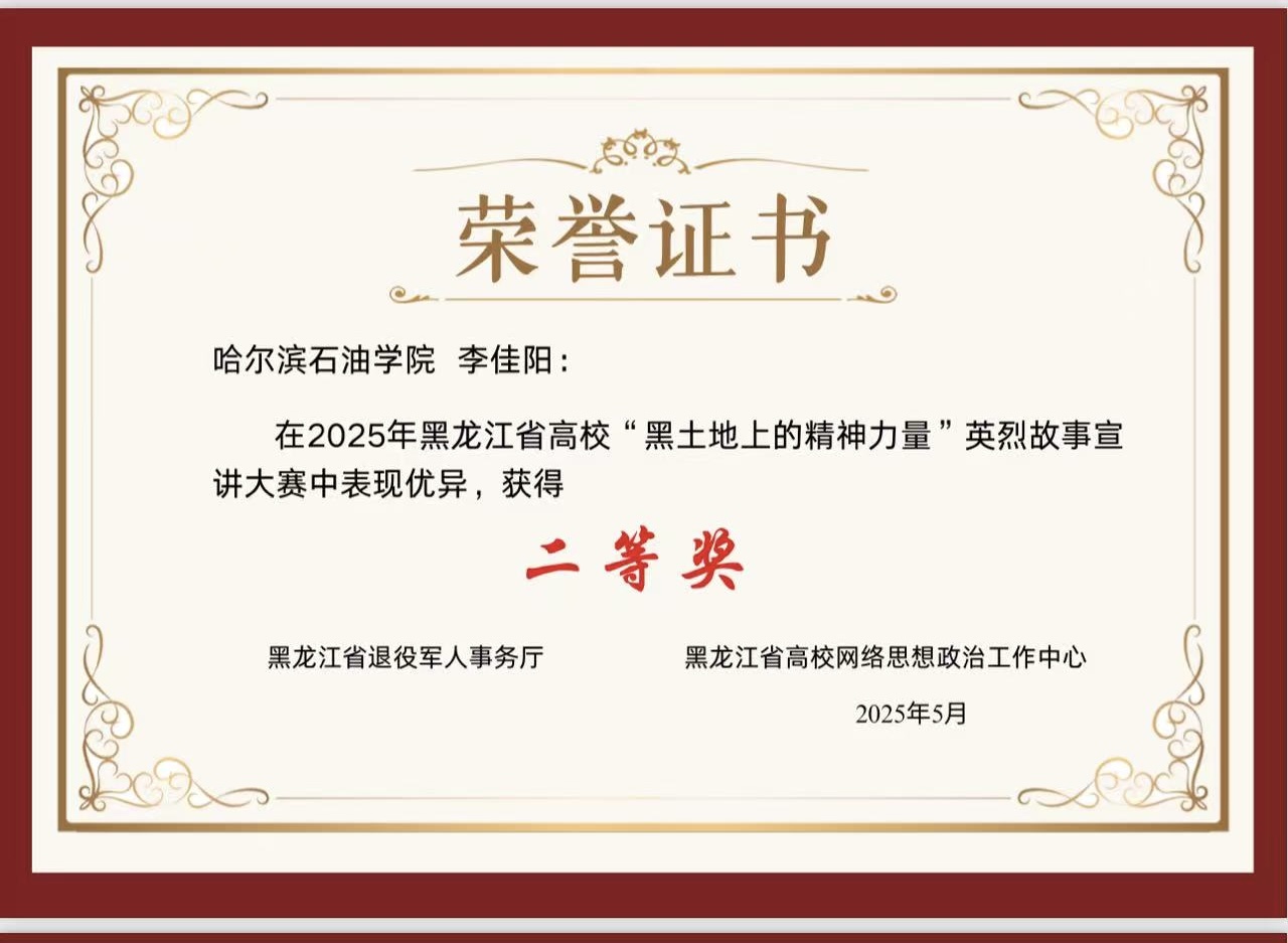 为纪念抗日战争暨世界反法西斯战争胜利80周年、抗美援朝出国作战75周年,黑龙江省退役军人事务厅、黑龙江省高校网络思想政治工作中心联合举办2025年黑龙江省高校“黑土地上的精神力量”英烈故事宣讲大赛。本次大赛共收到全省26所高校75份参赛作品,经严格评审,哈尔滨石油学院马克思主义学院教师李佳阳主讲的《铁人精神永放光芒》荣获二等奖。