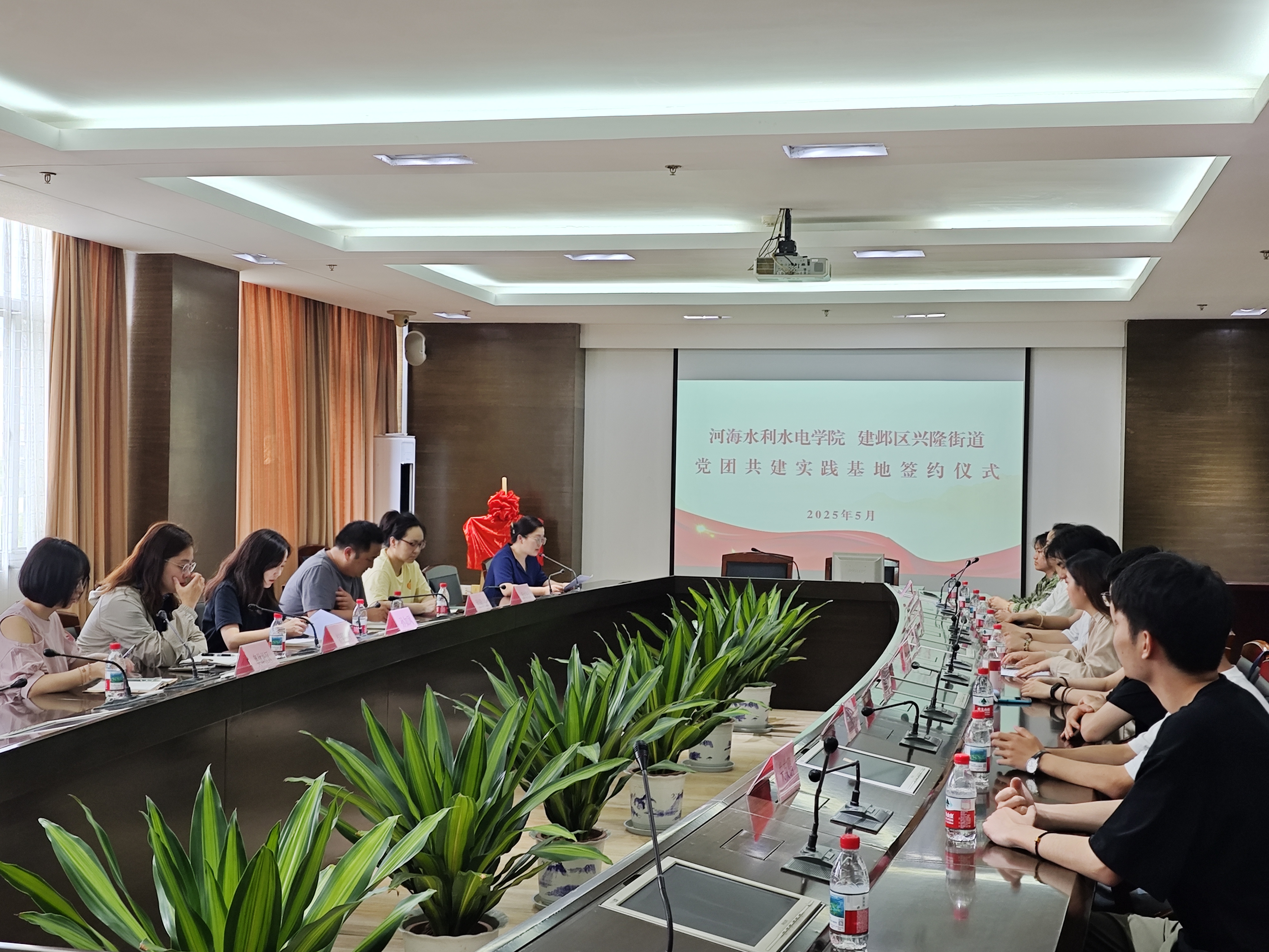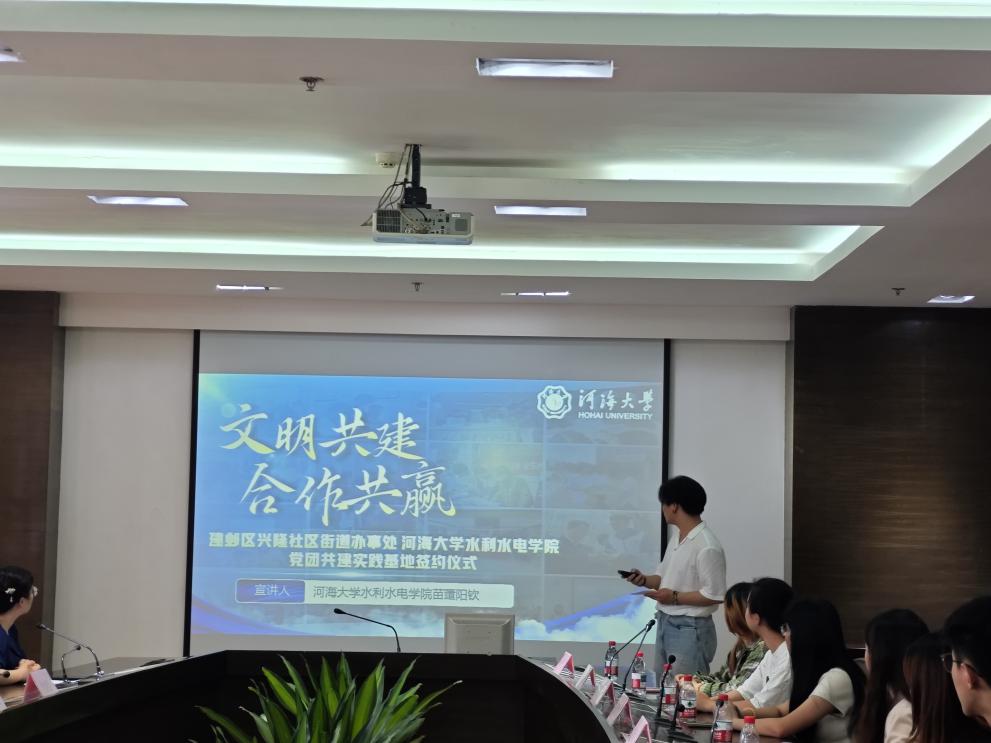 签约仪式以“合作共建党团共建实践基地”为主题,建邺区兴隆街道副主任孙如凤、河海大学水利水电学院团委书记笪步源等双方代表出席。仪式上,兴隆街道办事处副主任孙如凤介绍了兴隆街道的基本情况和民生服务水平,同时也回顾了街道与高校的合作历程,她表示:“依托高校的智力资源与青年力量,街此次签约标志着校地合作从短期项目式协作转向长效机制建设。随着实践基地的落地,高校智力资源与基层治理需求的精准对接将加速推进,为我院党团建设高质量发展注入新动能。道在民生服务精细化、社区治理创新中实现了突破。”河海大学水利水电学院团委书记、本科生第三党支部笪步源介绍了河海大学以及水利水电学院的基本情况,结合党建引领、团建赋能、水利特色的品牌项目,就此次校地合作交流提出新的想法和思考。她强调:“基地共建是深化产教融合的重要载体,学院团委和本科生第三党支部将以专业优势赋能基层发展,培养兼具理论素养与实践能力的青年人才。”