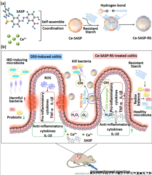 该课题是张晶同学在黄河科技学院纳米功能材料研究所进行的研究,课题利用金属有机配位聚合纳米多酶,制备了抗性淀粉包覆的铈-柳氮磺胺吡啶无限配位聚合物,实现炎症性肠病的治疗。研究结果显示,铈-柳氮磺胺吡啶无限配位聚合物可以通过调节氧化还原平衡、减轻炎症和改变肠道菌群来协同恢复肠道代谢微环境。这一研究成果不仅开发了多功能无限配位聚合物纳米药物,也为治疗炎症性肠病提供了一条简单、绿色和潜在的途径。