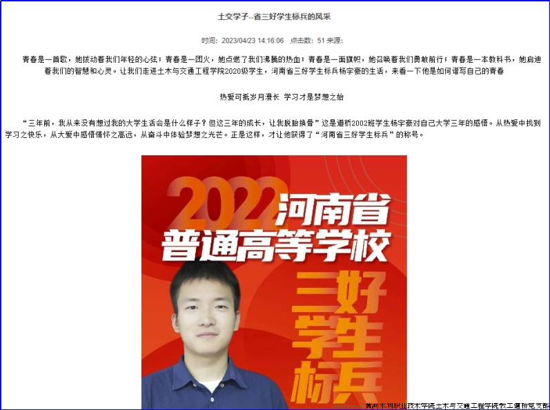 晁荟婷、杨宇豪同学是道路与桥梁工程技术专业2020级学生,入校以来就热爱专业,融入路桥社团,苦练技能,全面发展,先后参加“高教杯”等全国大学生技能大赛获得多项一等奖,大学生演讲比赛......一路披荆斩棘,在校期间先后获得国家励志奖学金、好青年讲好故事等多个奖项,成功入选为同年河南省优秀毕业生代表,在省内巡回宣讲示范打动了一批年轻人。