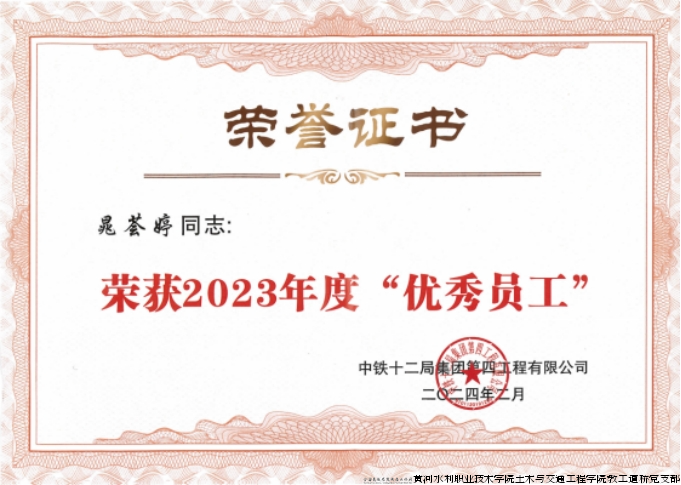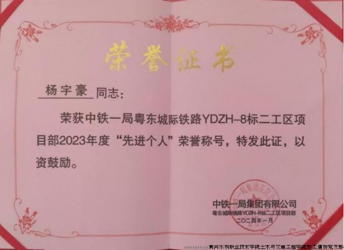 我校2020级学生晁荟婷,2023年毕业后就职于中铁十二局集团第四工程有限公司哈铁三标二工区从事资料员工作,该同学兢兢业业,善于规划,充分发挥自己在学校学到的知识和技能,在工作岗位上爱岗敬业、求真务实,业务能力和敬业精神都得到公司高度的认可,短短半年时间就收获了“中铁十二局优秀员工”称号。同班的杨宇豪同学在中铁一局第一建设有限公司粤东城际铁路YDZH-8二工区项目工作,除从事施工技术员、工区信息化管理员、项目团支部书记职位,该同学充分发挥自己的专业技能和党员优势,经过半年的努力,获得“2023年度粤东城际铁路项目先进个人”,“中铁一局一公司2024 年工程算量比武大赛三等奖”等多项荣誉,同时还带领支部获得“中铁一局青年文明号”。他们的成绩不仅促进了个人的成长,也促进了企业的蓬勃发展。就是这样一群“干一行爱一行”、有责任勇担当的年轻人,接着行业的接力棒,在交通强国梦的道路上前仆后继,一路前行!