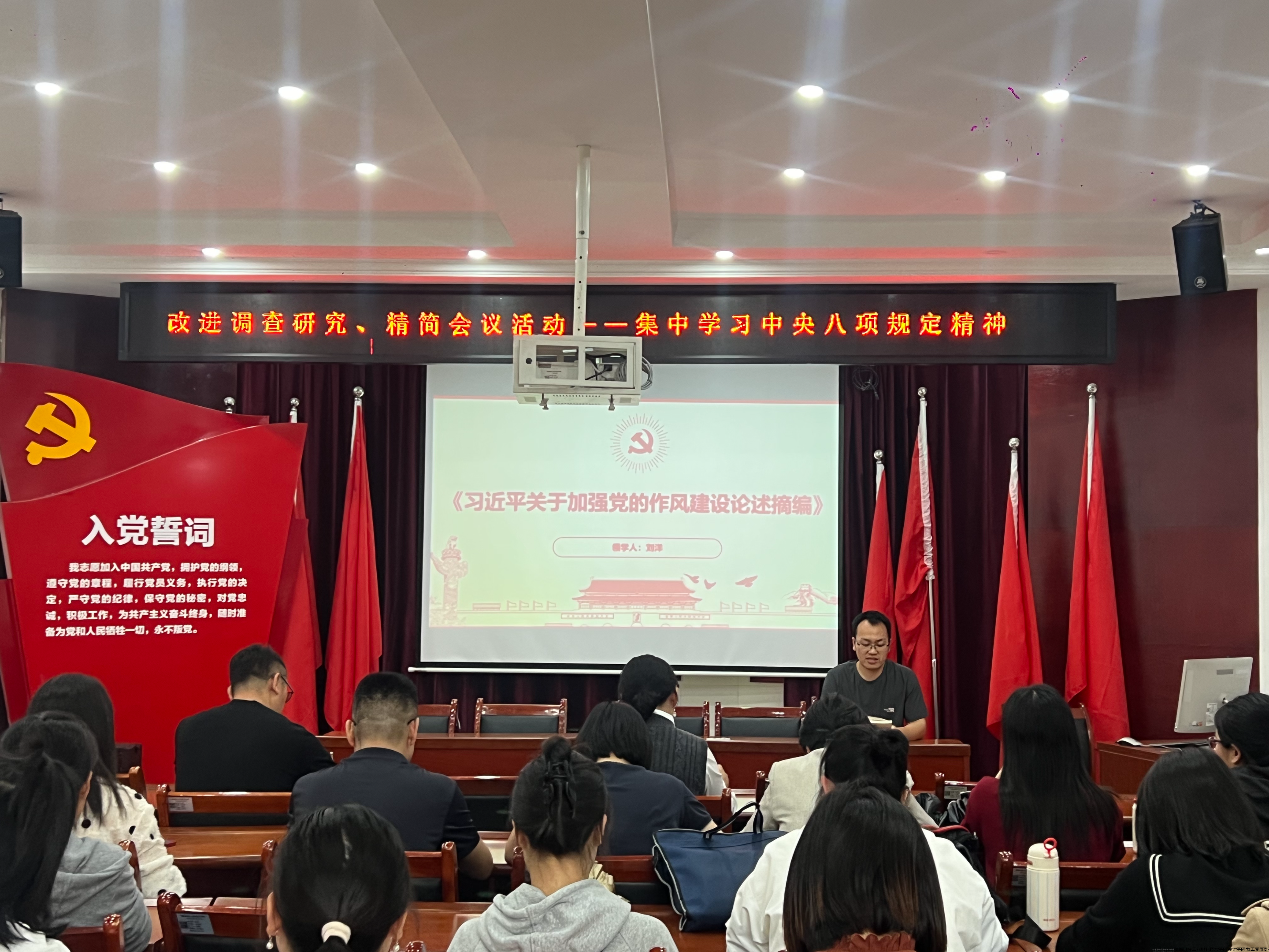 2025年4月22日,会计学院教工党支部在学院党员活动室举行"改进调查研究、精简会议活动——深入学习贯彻中央八项规定精神"主题党日活动。此次活动通过"专题学习+警示教育+实景课堂"三维模式,引导党员教师深刻领会习近平总书记关于作风建设的重要论述精神,将中央八项规定作为新时代共产党人的行为准则,为落实立德树人根本任务提供坚实作风保障。