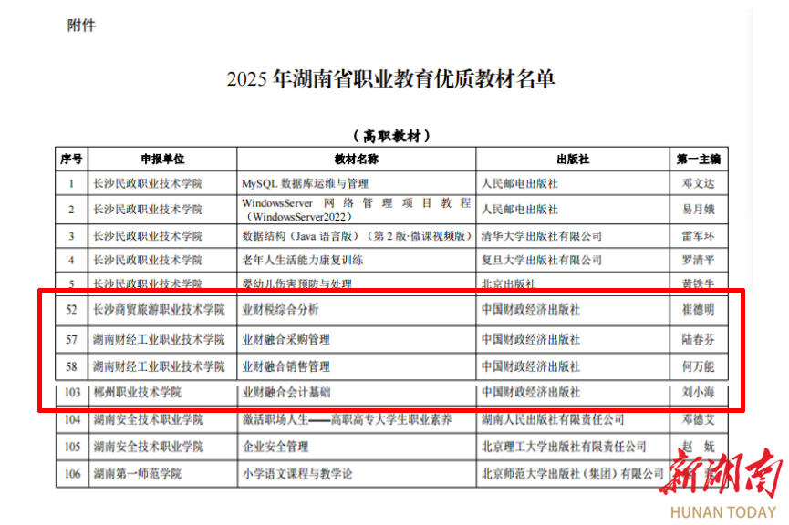 近日,2025年湖南省职业教育优质教材认定结果揭晓,由全国业财税融服务行业产教融合共同体、湖南财经工业职业技术学院牵头组织编写的“四流融合”新质财经系列教材《业财融合销售管理》《业财融合采购管理》《业财融合会计基础》《业财融合综合分析》入选省级优质教材;更值得一提的是,上述4部教材及《业财融合筹资管理》《业财融合投资管理》6部教材获推第二批“十四五”职业教育国家规划教材。