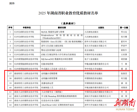 湖南财工职院四部教材入选2025年湖南省职业教育优质教材