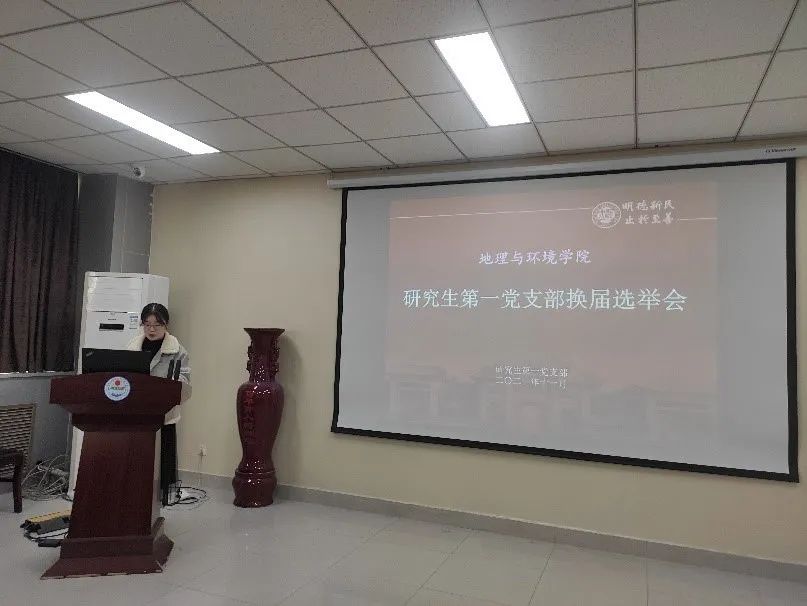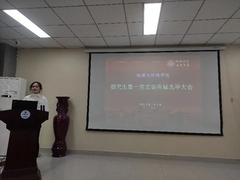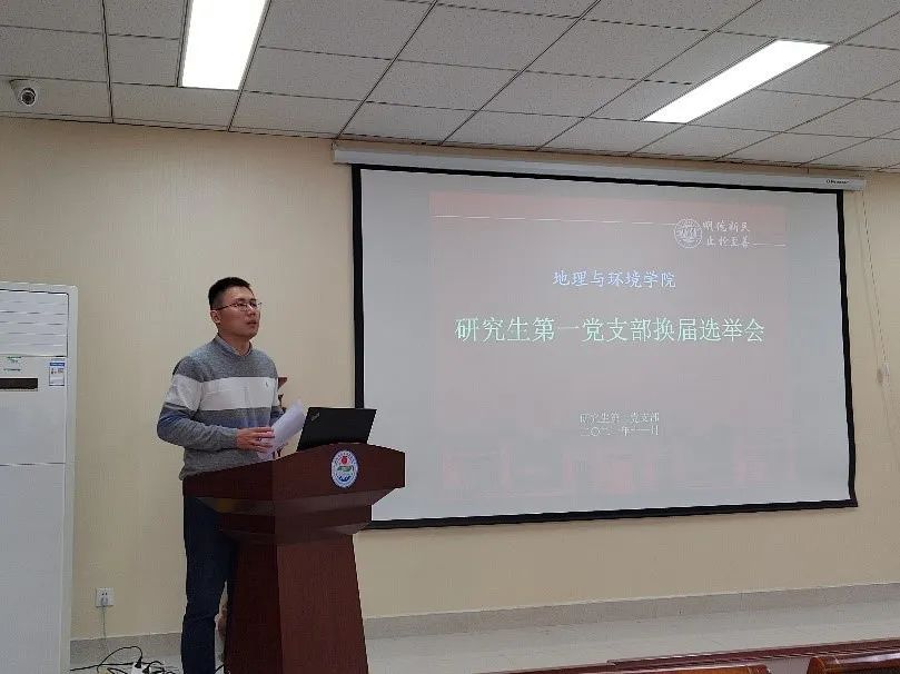根据《中国共产党章程》《中国共产党基层组织选举工作条例》等有关党内法规要求,11月16日下午两点半,地理与环境学院研究生第一党支部、第四党支部在学院二楼报告厅召开换届选举大会,2020级研究生辅导员时振钦出席会议,会议由上届研究生第一党支部组织委员田卡吨同志主持。