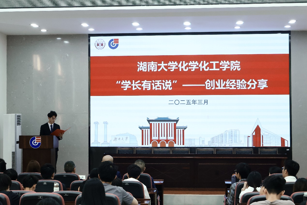 3月25日下午14:30,湖南大学化学化工学院“学长有话说”品牌活动在新化工楼D区报告厅顺利举行。本次活动邀请到四位优秀校友企业家分享他们的创业历程与行业洞见,为在校学子带来了一场充满启发的经验交流盛宴。学院党委副书记李洪玉、学科建设与科研办公室主任曾芳、团委书记蒋晓洁参加本次活动。活动由化工院研会主席夏浩瑀主持,吸引了众多师生到场参与。
