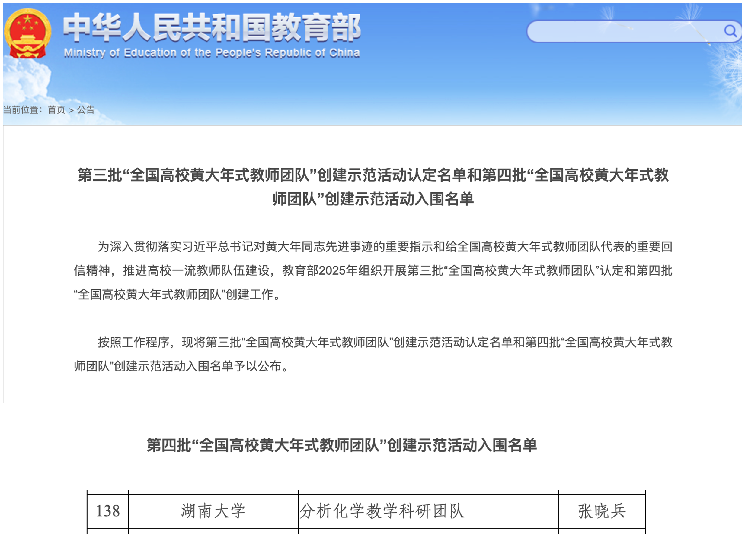 近日,教育部公布了第四批“全国高校黄大年式教师团队”入围名单,张晓兵教授领衔的分析化学教学科研团队成功入选。这是我校教师团队连续第四次入选“全国高校黄大年式教师团队”名单。