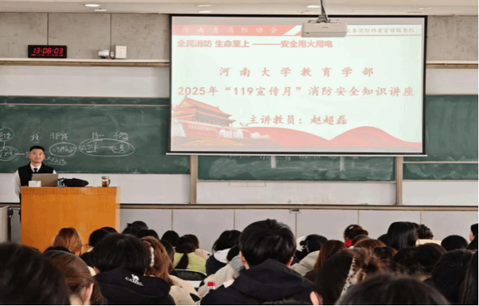 为进一步强化师生的消防安全意识,提高火灾应急处置和自救互救能力,教育学部于2025年11月13日在7305教室及学部西北角开展“119宣传月”消防安全知识讲座。本次活动由教育学部邀请教员赵超磊讲解,包含专题讲座和实操演练两部分,学部教师、各年级本科生、研究生寝室代表参加。
