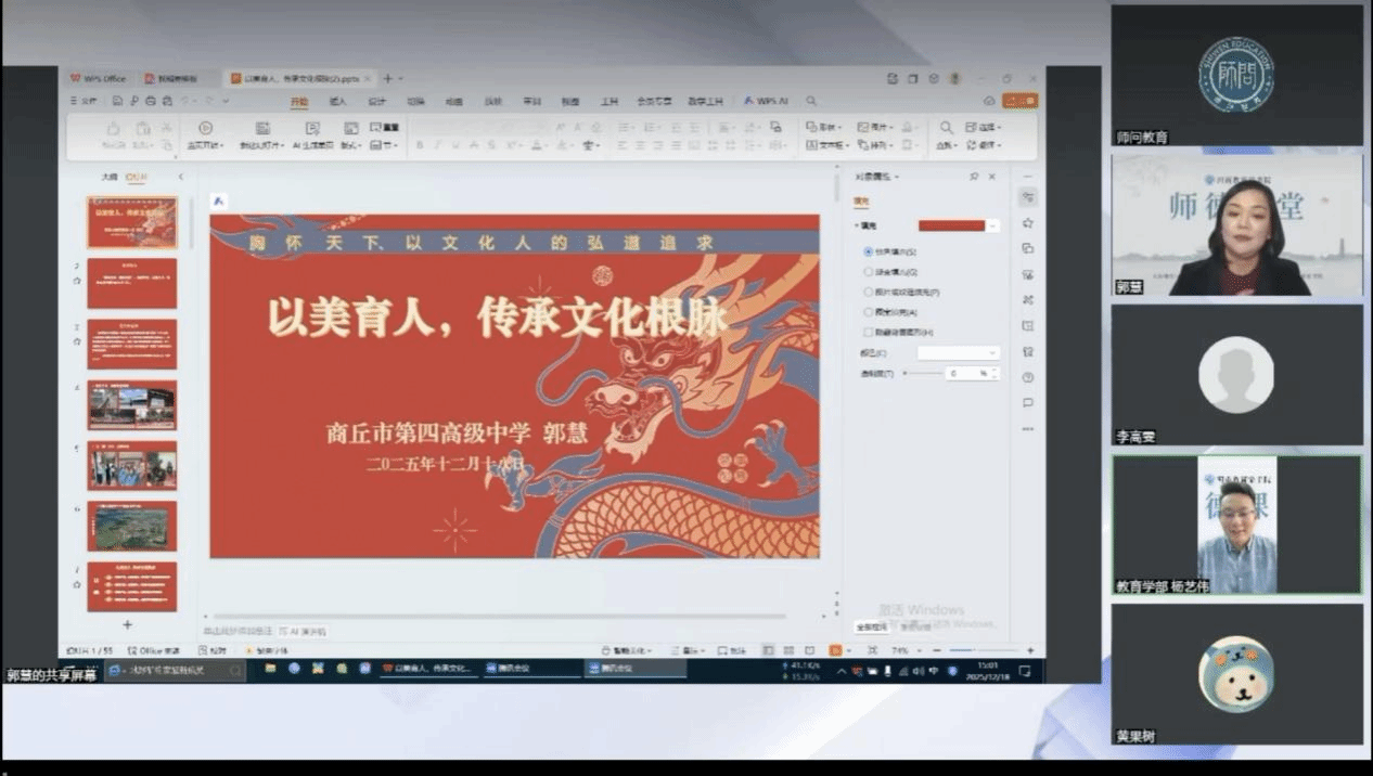 12月18日下午15点,河南教育家书院师德课堂第十季第六讲顺利开讲。商丘市第四高级中学美术教师、班主任,2025年河南省师德先进个人,商丘市市三八红旗手、优秀教师、学术技术带头人郭慧,受邀作题为《以美育人,传承文化根脉》的讲座,本次讲座由河南大学教育学部教师杨艺伟主持。