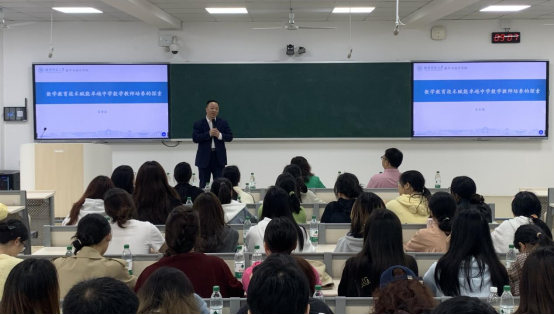 在晨光中,师生们来到了湖南师范大学数学与统计学院。湖师大数统院热情接待了来访师生。院长李利平、副院长郭水霞与我院学生亲切交流,句句犹如智慧的甘霖,滋润着学生们的心灵。袁智强教授以其渊博的学识和深厚的学术底蕴,为学生带来了主题为“数学教育技术赋能卓越中学数学教学教师培养的探索”的精彩讲座,带领学生畅游在数学研究的浩瀚星河里。讲座后的答疑环节,袁智强教授对学生提出的考研择校择专业、师范生技能大赛准备等问题,细致入微地剖析并耐心解答,为学生拨云见日。随后,两院学生积极互动,展开深度交流,每一次对话都闪耀着思想碰撞的光芒,欢声笑语中友谊的种子也悄然种下。