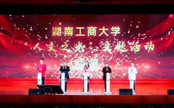 随后,与会校领导与学生代表在全场观众齐声倒数中按下按钮,共同启动湖南工商大学“人文之光”主题活动。现场公布了第三届“我爱湖工商,共建新时代”校园文化作品大赛六个赛道的一等奖获奖名单,观众席响起热烈的掌声。