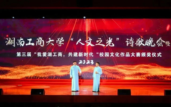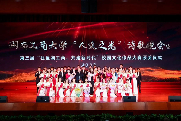 工商传雅韵,诗书育风华。12月20日晚,湖南工商大学在湘江楼湘江报告厅举行“人文之光”诗歌晚会暨第三届“我爱湖工商,共建新时代”校园文化作品大赛颁奖仪式。湖南工商大学党委书记、湘江实验室主任、中国工程院院士陈晓红,副校长张玲,校党委委员、副校长杨良奇出席活动。各二级部门、学院负责人及师生代表参加。