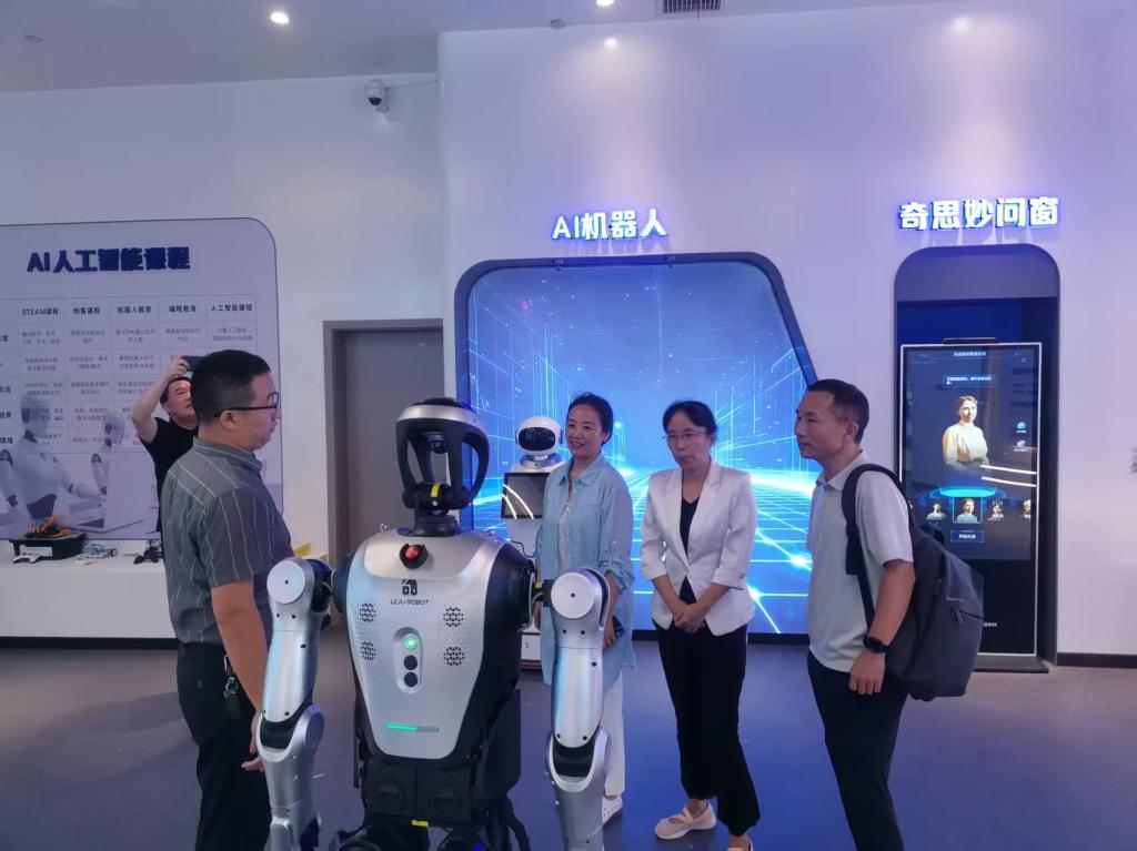 考察最后一站为驼人新城学校,在学校综合服务部郑海磊主任的引导下,学院领导兴致勃勃地参观了学校科技馆AI体验中心,亲身体验了先进的科技教育设施。随后,双方在科技楼会议室进行了座谈。郑主任系统汇报了驼人新城学校在数字化校园建设及科技特色教育方面取得的丰硕成果。