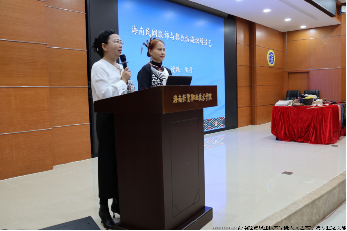 讲座中,陈丹老师结合自身多年传承实践,从海南民间服饰文化渊源、黎族纺染织绣技艺历史脉络切入,详细讲解技艺核心流程、纹样寓意及材质特色,通过实物展示、技艺演示等直观方式,生动呈现黎族纺染织绣的匠心巧思与文化内涵。同时,老师围绕非遗技艺现代转化、校企协同传承等话题与师生互动交流,为专业教学创新、非遗文化传播提供实用思路。