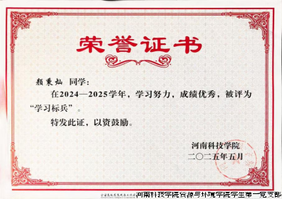学风赋能促成长,支部机制筑平台。优良学风是支部发展的灵魂,学生第一党支部立足学科特色,打造“立体式学风推进模式”,通过党员先锋岗、朋辈帮扶小组、学科竞赛攻坚队等特色载体,形成“比学赶超、互帮共进”的浓厚学习氛围。支部推行的“党员学业领航”制度,让优秀党员牵头组建学习帮扶团队,精准对接同学学习需求,有效破解学业难题,这一特色管理举措在颜秉灿同学身上得到充分体现。作为支部培育的学业标兵,他始终秉持“勤学、修德、明辨、笃实”的优良学风,在支部学风氛围的浸润下,将钻研精神贯穿学习全过程,连续四个学期以专业排名第一(1/60)的优异成绩斩获校级一等奖学金,平均绩点高达3.85,获评“学习标兵”“三好学生”等荣誉称号。