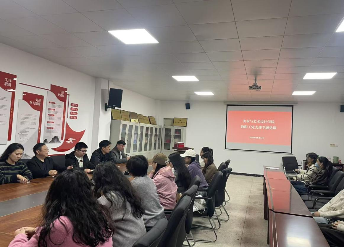 10月14日下午,美术与艺术设计学院教职工党支部组织开展专题党课。学院党委书记刘春华,副书记孔建富、侯佳富及支部全体党员聆听党课。本次党课由教职工党支部书记汪训主讲。