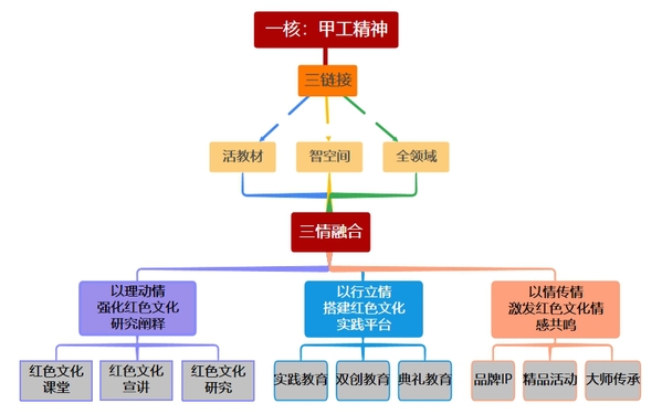 精品项目《“一核三链三融合”构建红色基因传承工程新范式》按照“我们从哪里出发”—“现在在哪里”—“将要到哪里去”的逻辑,深入挖掘校史中蕴含的红色基因,以最早办学源头“红色甲工”为精神内核,打造“活教材”“智空间”“全领域”链接,强化红色文化研究阐释、搭建红色文化实践平台、激发红色文化情感共鸣,整合地缘优势、学科特色、校内外资源等,构建“一核三链三融合”红色基因传承工程新范式,推动红色资源开发利用和应用转化,传承学校百年办学中积淀的文化传统,努力培养高素质、高层次、多样化、具有家国情怀和全球视野、未来能够担当民族复兴大任的“三创型”人才。