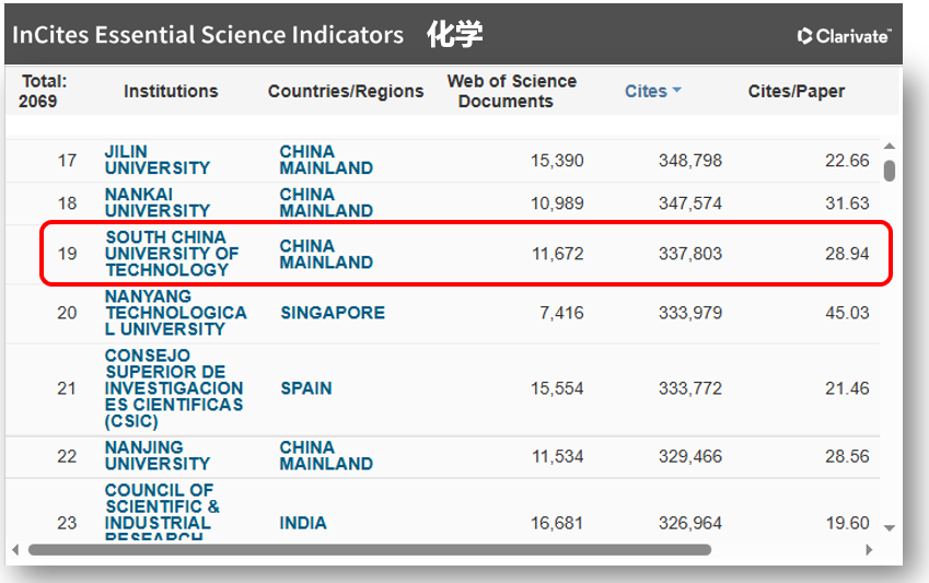 5月8日,科睿唯安公布了基本科学指标数据库(Essential Science Indicators,简称ESI)最新统计数据,华南理工大学化学学科首次进入ESI全球前万分之一行列,标志着学校化学领域的研究水平达到世界顶尖层次。这是继工程学之后,华南理工大学又一个进入ESI全球前万分之一的学科。